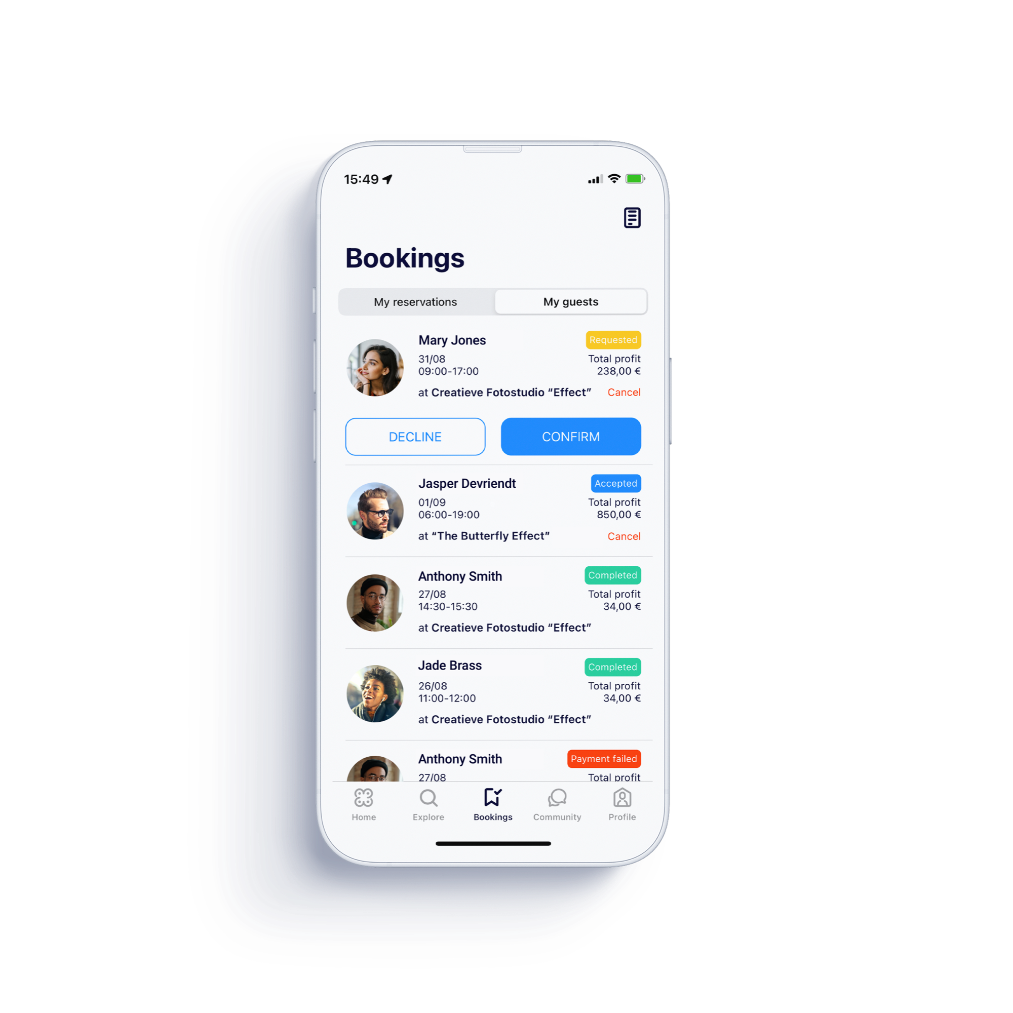 Once a Host (renter) publishes a space, the Guest (rentee) can request a booking for a specific period and time. You can request from as little as one hour to a complete month. The Host can either accept or deny the request without any costs. The request will remain until the actual starting period, however, we suggest to always accept or deny as soon as possible. This ensures a smooth user experience for the Guest. Once If the Host accepts the request, the Guest will be prompted to pay in order to confirm the booking. The payment is provided by Stripe that enables Visa, Mastercard and Bancontact. As soon as the booking is confirmed as result of the payment, both parties will get a booking confirmation with a calendar appointment. On the day of the booking, the Host is responsible for receiving the Guest into the booked space and allowing its use. After the booking is completed, there is a 14 day waiting period until the money is available in the Stripe account of the Host. This gives us the possibility to intervene in case of any issues. After that period, the amount will appear in the app and can be transferred to the bank account of the Host from the amount of €100,00.